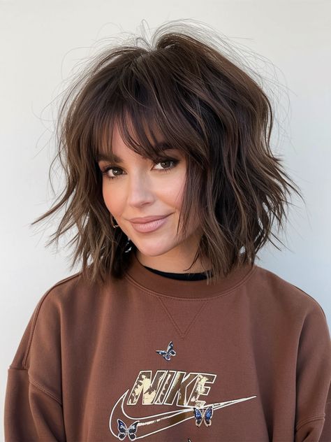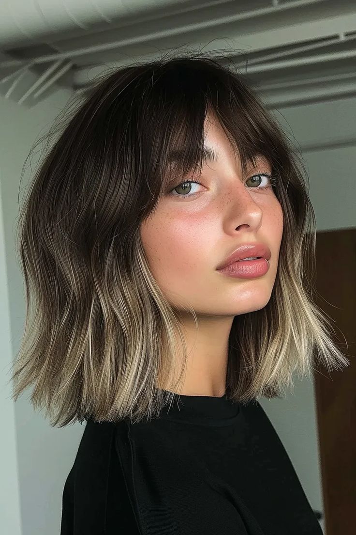 Dieser Schnitt kombiniert einen mittellangen, leicht gestuften Bob mit einem die Stirn umspielenden, fransigen Curtain Bangs-Pony. Die Curtain Bangs lenken den Blick auf die Augenpartie und erzeugen dabei die Illusion, dass der Rest des Haares am Oberkopf voller erscheint und weicher fällt.
